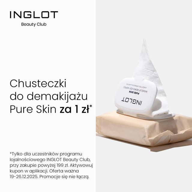 Zrób zakupy w dniach 19-26.12.2025 korzystając z kuponu rabatowego, który znajdziesz w aplikacji mobilnej INGLOT lub na stronie inglot.pl w zakładce Moje Konto i zyskaj chusteczki do demakijażu Pure Skin za 1 zł przy zakupach powyżej 199 zł.